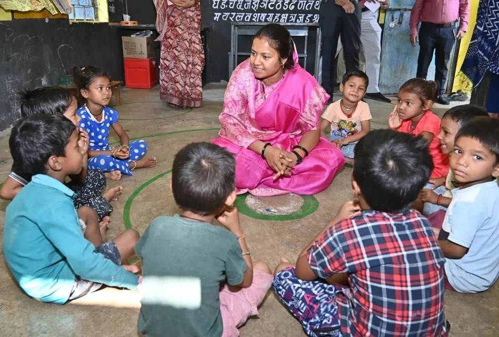 धमतरी जिले के ग्राम तेलिनसत्ती में आंगनबाड़ी केंद्र क्रमांक-2 का दौरा करते हुए श्रीमती राजवाड़े ने बच्चों को दी जा रही सुविधाओं का जायजा लिया। उन्होंने बच्चों के साथ फर्श पर बैठकर खेल-खेल में परिचय किया, उनके नाम पूछे और चॉकलेट बांटी। बच्चों से नाश्ता व भोजन के बारे में जानकारी लेते हुए उन्होंने आंगनबाड़ी कार्यकर्ताओं को निर्धारित समय पर भोजन और नाश्ता देने के निर्देश दिए। पोषक आहार की गुणवत्ता सुनिश्चित करने, गर्मी को देखते हुए पीने का पानी और ओआरएस की व्यवस्था करने, और केंद्रों को सुबह 7 से 11 बजे तक खोलने के निर्देश भी दिए।मंत्री ने बच्चों को खेल-खेल में व्यवहारिक ज्ञान देने, पढ़ाई पर ध्यान देने और साफ-सफाई का महत्व सिखाने पर जोर दिया। उन्होंने कहा कि आंगनबाड़ी केंद्रों को बच्चों के लिए सुरक्षित, सुविधायुक्त और अनुकूल बनाया जाए।