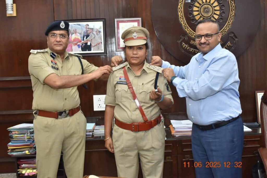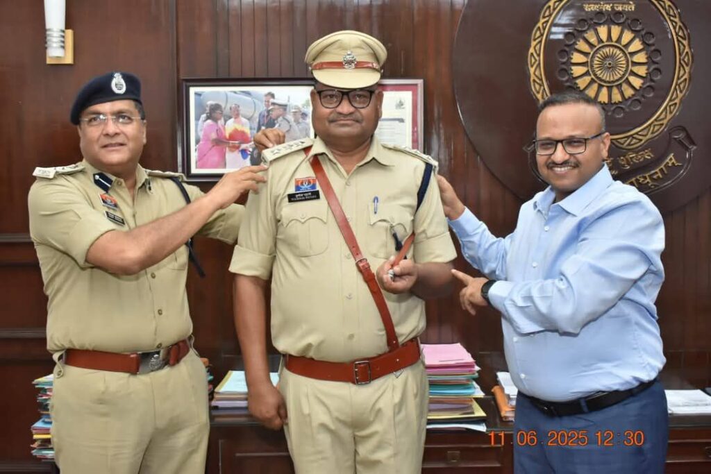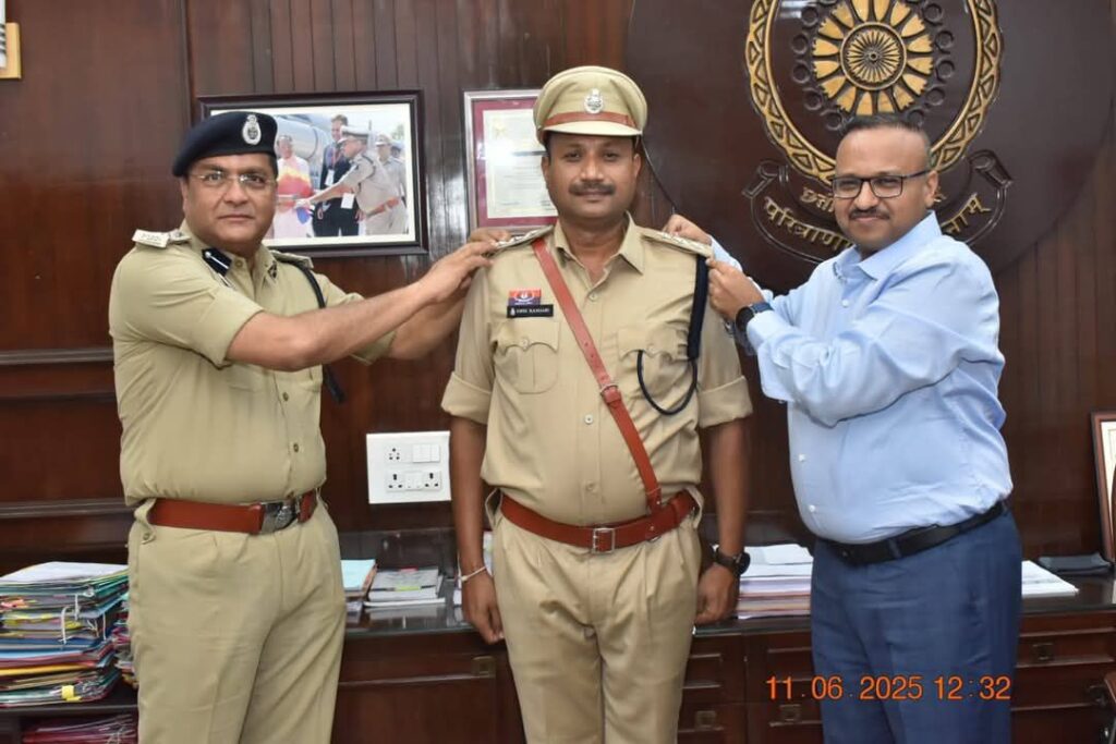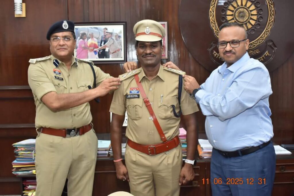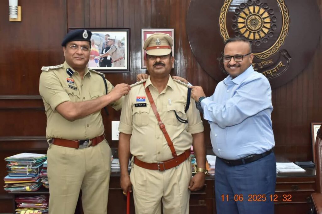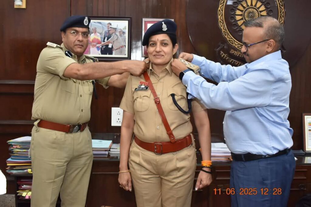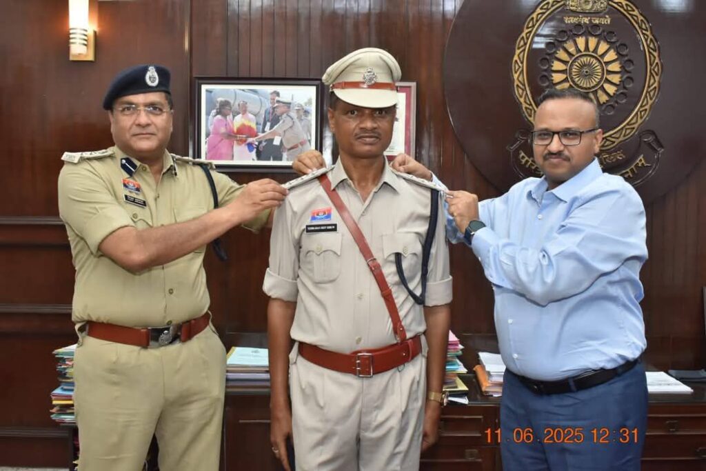 पुलिस महानिरीक्षक दुर्ग रेंज द्वारा “पीपिंग सेरेमनी” में स्टार लगाकर किया पदोन्नत।