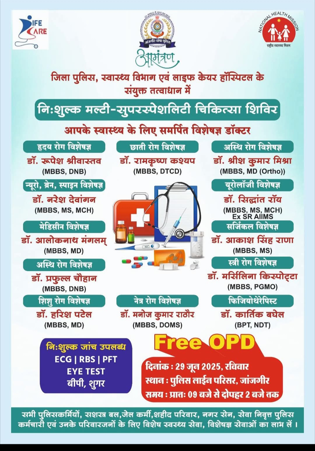 ज्ञात हो कि पुलिस अधीक्षक महोदय जांजगीर चांपा द्वारा पुलिस कर्मियों एवं उनके परिजनों के स्वास्थ्य को दृष्टिगत रखते हुए दिनांक 29.06.2025 दिन रविवार को पुलिस लाइन जांजगीर में प्रातः 09.00 बजे से निःशुल्क चिकित्सीय परामर्श परीक्षण एवं ओषधि वितरण शिविर का आयोजन किया जाएगा जिसमें अनुभवी चिकित्सकों के द्वारा जांच एवं चिकित्सकीय उपचार किया जाएगा।