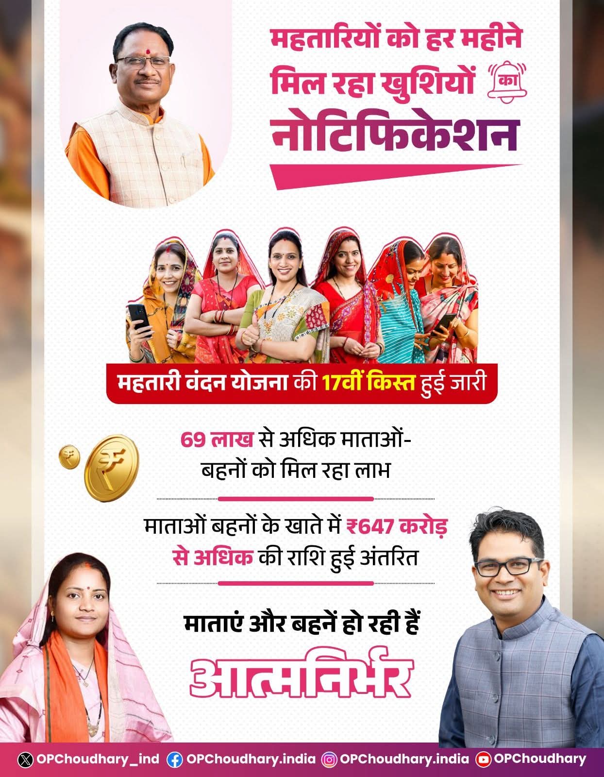 महतारी वंदन की राशि केवल आर्थिक सहायता नहीं है, बल्कि यह महिला सशक्तीकरण के क्षेत्र में एक उत्कृष्ट कार्य है, जिसके लिए हमारी सरकार प्रतिबद्ध है। अब हमारी माताएँ-बहनें किसी पर आश्रित नहीं हैं वे इस योजना के माध्यम से आत्मनिर्भर बन रही हैं।