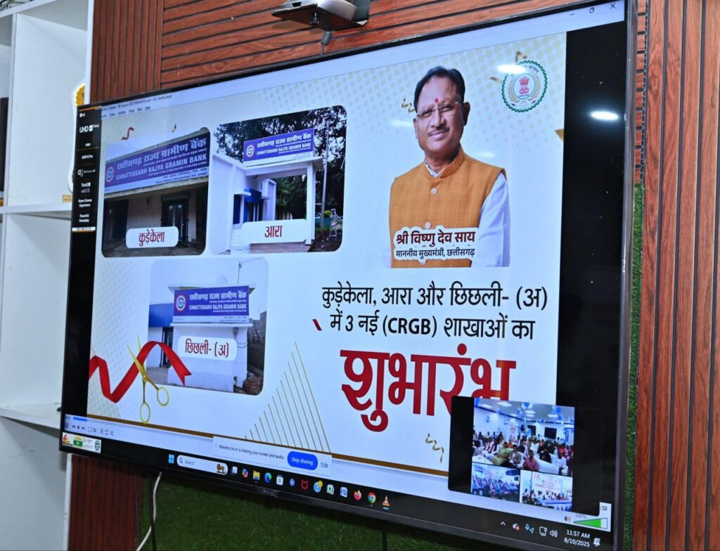 मुख्यमंत्री साय ने जशपुर जिले के बगिया ग्राम में मुख्यमंत्री कैंप कार्यालय से वर्चुअल माध्यम से जशपुर विकासखंड के ग्राम आरा, पत्थलगांव विकासखंड के ग्राम कुडे़केला (घरजियाबथान) और बगीचा विकासखंड के ग्राम छिछली में छत्तीसगढ़ राज्य ग्रामीण बैंक की नई शाखाओं का लोकार्पण किया। इस अवसर पर उन्होंने छत्तीसगढ़ राज्य ग्रामीण बैंक के 12वें वार्षिक प्रतिवेदन का भी विमोचन किया।
