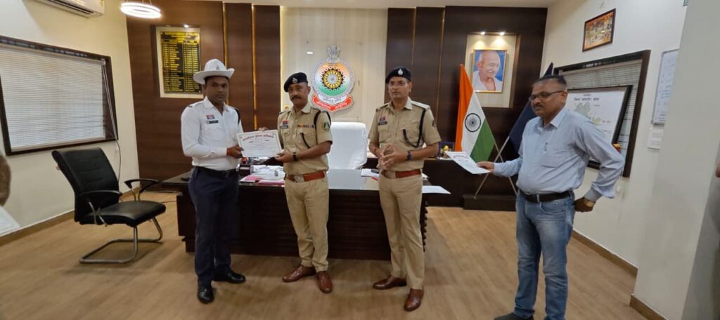 यातायात शाखा से निरीक्षक लालन पटेल, प्रधान आरक्षक छोटेलाल अजगल्ले, आरक्षक (चालक) सुनील सिंह राजपूत जिसके द्वारा लापरवाही पूर्वक वाहन चलाने वालों के विरुद्ध नियमानुसार चलानी कार्यवाही करना।