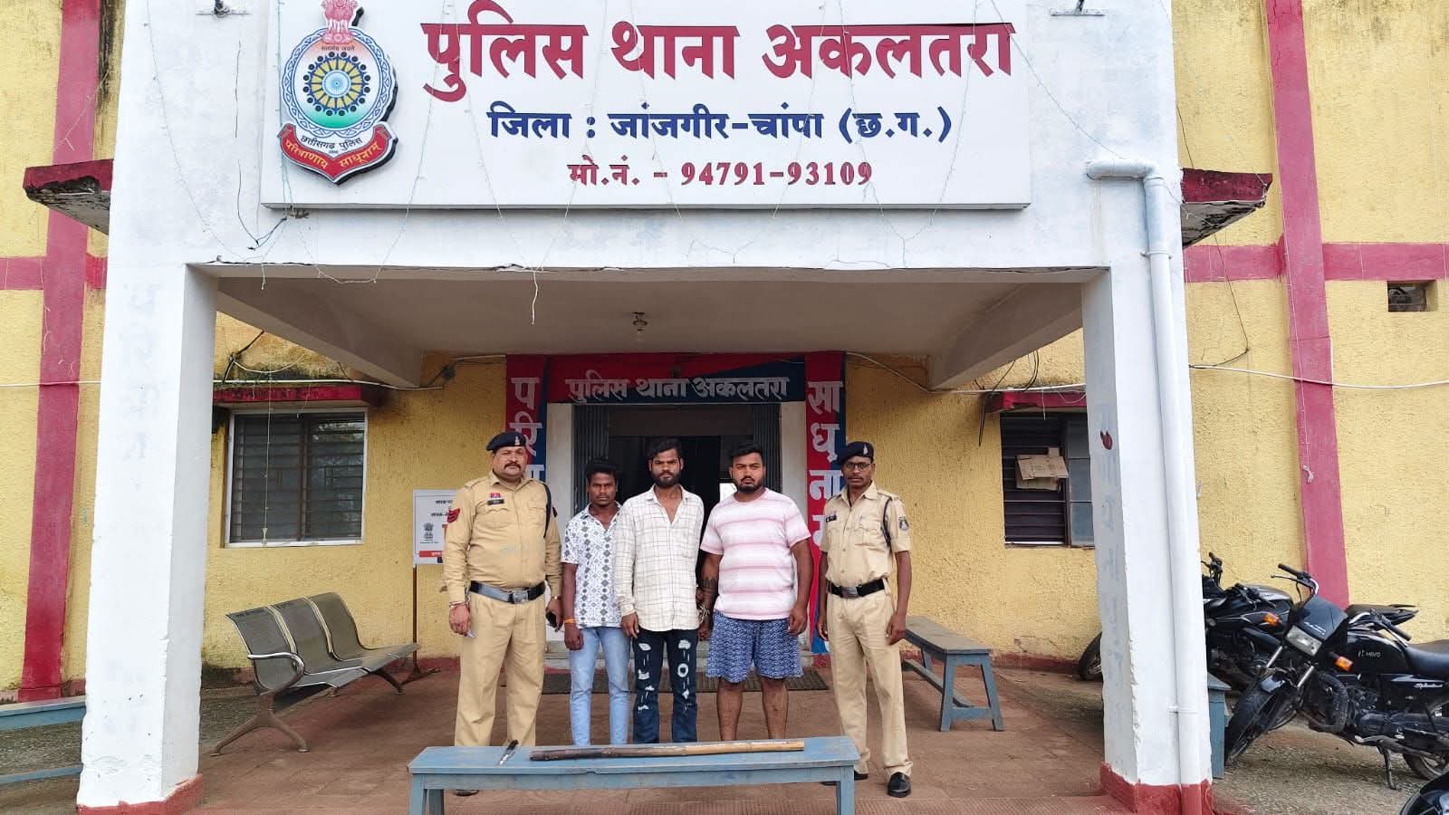 हत्या के प्रयास जैसे अपराध को गंभीरता से लेते हुए विजय कुमार पाण्डेय (IPS) पुलिस अधीक्षक जांजगीर -चाम्पा के निर्देशन में एवं उमेश कुमार कश्यप अति. पुलिस अधीक्षक जांजगीर एंव प्रदीप सोरी अनु. अधिकारी अकलतर के मार्गदर्शन में आरोपीगण 01.रवि श्रीवास 02. कन्हैया गोड 03. सोनू उर्फ राजेश विश्वकर्मा सभी निवासी संजय नगर, वार्ड नं. 03 अकलतरा थाना-अकलतरा को हिरासत मे लेकर पूछताछ किया गया जो उपरोक्त तीनों आरोपी पूछताछ में घटना दिनांक व समय पर घटना कारित करना अपना अपना जुर्म स्वीकार किये जाने पर घटना में प्रयुक्त चाकू, डंडा बरामद कर आरोपीयो को विधिवित गिरफ्तार कर न्यायिक रिमाण्ड पर भेज