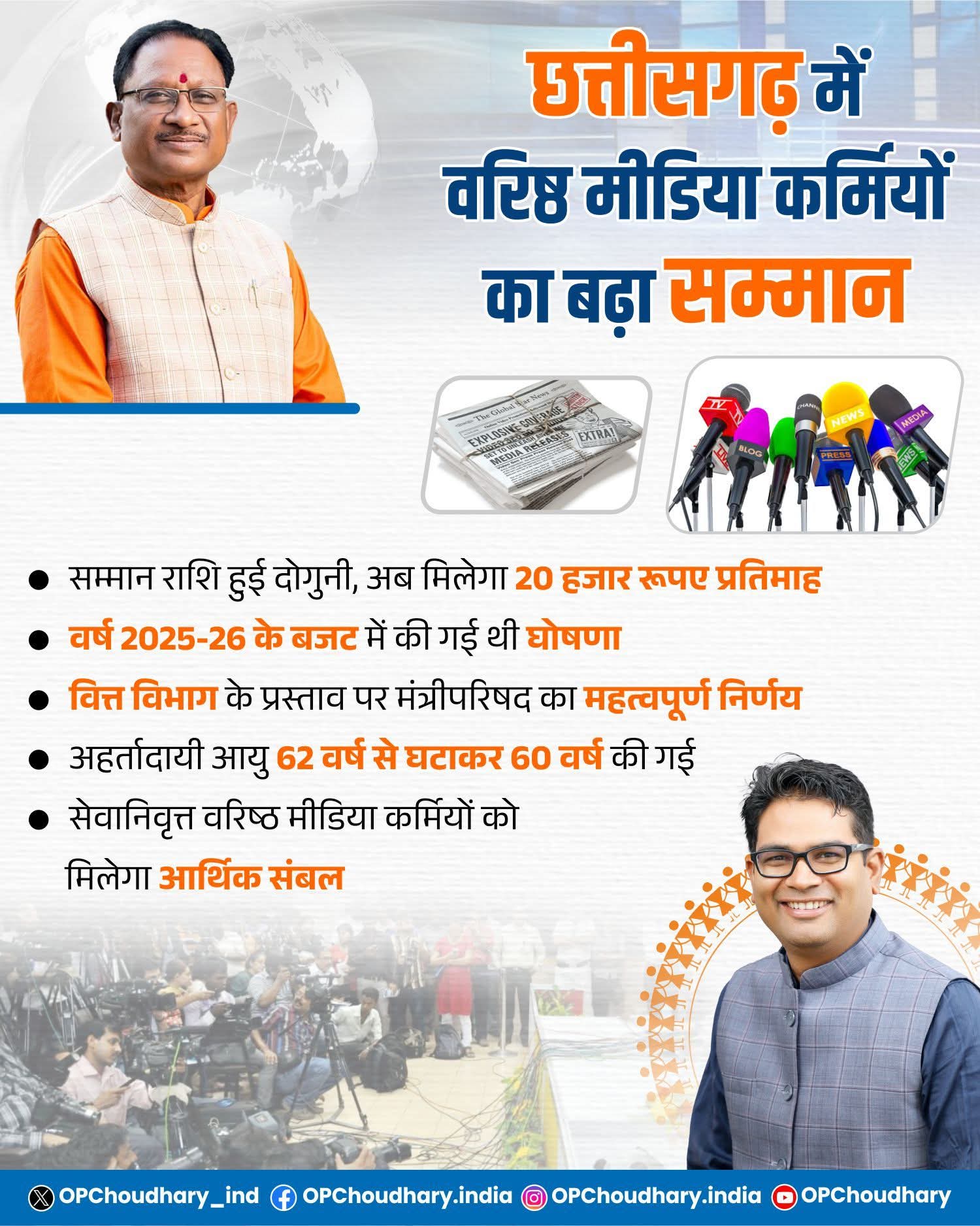 हमारी सरकार ने वरिष्ठ मीडियाकर्मियों के सम्मान और सहयोग के लिए एक ऐतिहासिक फैसला लिया है। वर्ष 2025-26 के बजट में घोषित प्रावधान के अनुसार अब सेवानिवृत्त वरिष्ठ मीडिया कर्मियों को प्रतिमाह 20 हजार रूपए की सम्मान राशि दी जाएगी।