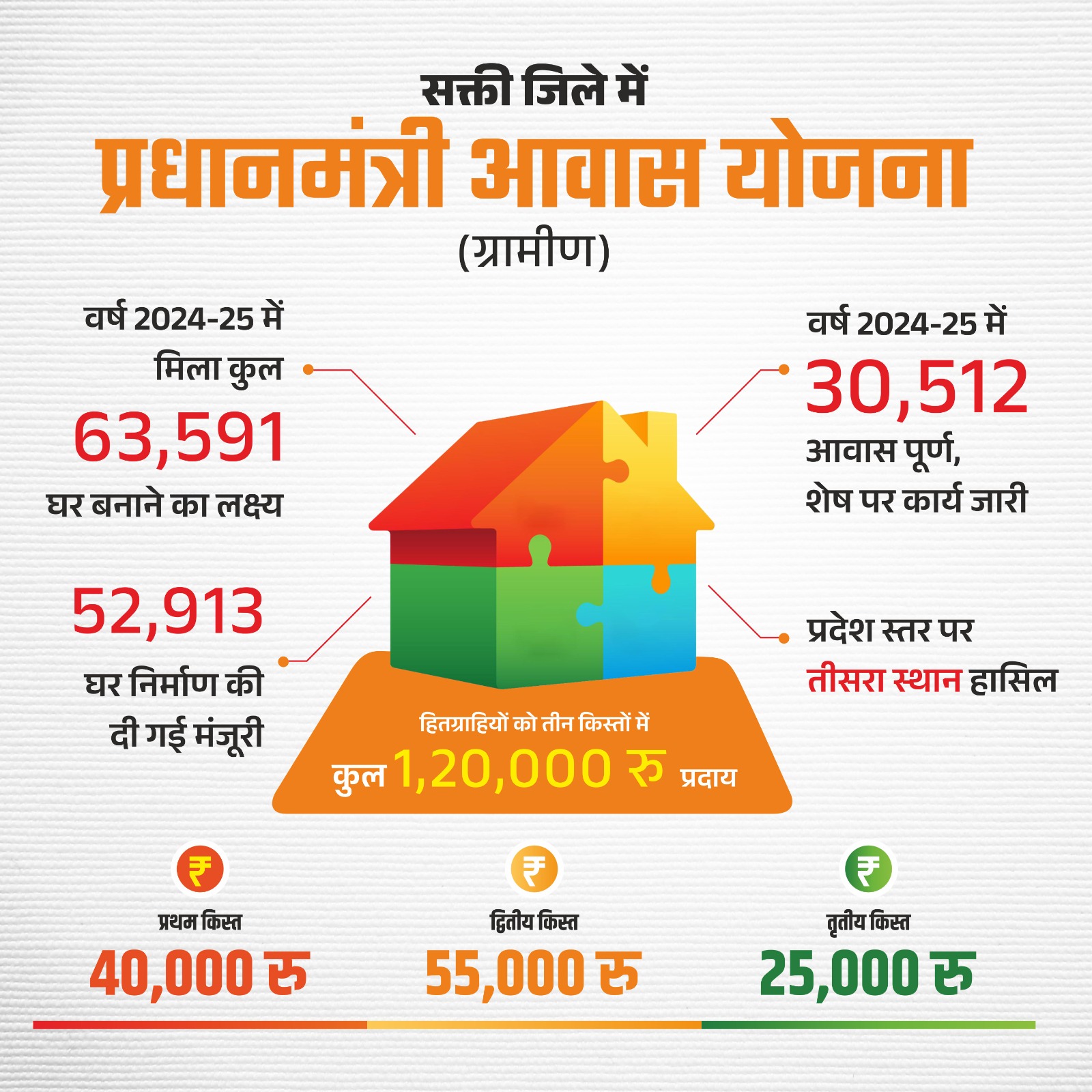 प्रधानमंत्री आवास योजना का उद्देश्य हर गरीब परिवार को सुरक्षित और पक्का घर देना है। सक्ती जिले में यह लक्ष्य कलेक्टर अमृत विकास तोपनो और जिला पंचायत के मुख्य कार्यपालन अधिकारी (सीईओ) वासु जैन के मार्गदर्शन में मिशन मोड में पूरा किया गया। प्रशासन ने इस काम को पूरी गंभीरता और प्रतिबद्धता के साथ अंजाम दिया। इस वर्ष 2024-25 में जिले के लिए कुल 63,591 घर बनाने का लक्ष्य रखा गया था। इनमें से 52,913 घरों को मंजूरी दी गई। निर्माण की गति बनाए रखने के लिए सरकार ने तीन किश्तों में वित्तीय सहायता भी जारी की। पहली किश्त 51,427 हितग्राहियों को, दूसरी किश्त 40,318 हितग्राहियों को, और तीसरी किश्त 25,065 हितग्राहियों को दी गई। समय पर इस तरह की वित्तीय मदद मिलने से निर्माण कार्य में तेजी बनी और लक्ष्य समय पर पूरा हो सका। कलेक्टर श्री अमृत विकास तोपनो ने बताया कि सक्ती जिले की इस सफलता के पीछे कई कारक हैं। सबसे पहले, नियमित फील्ड विजिट से यह सुनिश्चित किया गया कि निर्माण का काम समय पर और गुणवत्तापूर्ण तरीके से हो। इसके साथ ही मैदानी स्तर के अधिकारियों कर्मचारियों द्वारा हितग्राहियों से लगातार संवाद कर उनकी समस्याओं व शंकाओं का त्वरित समाधान किया गया। इसके अलावा, तकनीकी मार्गदर्शन और समय पर किश्तों का भुगतान भी हितग्राहियों को उत्साहित और समर्थ बनाए रखने में मददगार रहा। सक्ति जिले में बनाए गए नए मकान न केवल आश्रय हैं, बल्कि यह गरीब परिवारों के जीवन में बड़ा बदलाव लाते हैं। अब परिवार असुरक्षित कच्चे घरों की जगह मजबूत और टिकाऊ घरों में रह रहे हैं। इससे उन्हें सुरक्षा, आत्मसम्मान और सामाजिक सुरक्षा का अनुभव भी मिला है। विशेष रूप से यह बात उल्लेखनीय है कि अधिकांश मकानों का निर्माण उन परिवारों के लिए किया गया है जो वर्षों से आर्थिक कठिनाइयों के कारण पक्का घर नहीं बना पा रहे थे। इस योजना के माध्यम से उन्हें सरकार की मदद और सहयोग मिलने के साथ-साथ जीवन जीने की नई आशा भी मिली है। सक्ति जिले की यह उपलब्धि न केवल राज्य बल्कि पूरे देश के लिए प्रेरणा का स्रोत है। यह दर्शाती है कि अगर जिला प्रशासन, सरकारी अधिकारी और हितग्राही मिलकर मेहनत करें तो बड़े लक्ष्यों को तेजी से पूरा किया जा सकता है।