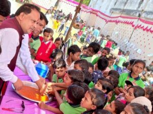 इन पलों में मुख्य अतिथि एवं विद्यालय प्रबंधक दुलीचंद साहू ने बच्चों के साथ विशाल केक काटकर मेले का विधिवत शुभारंभ किया।