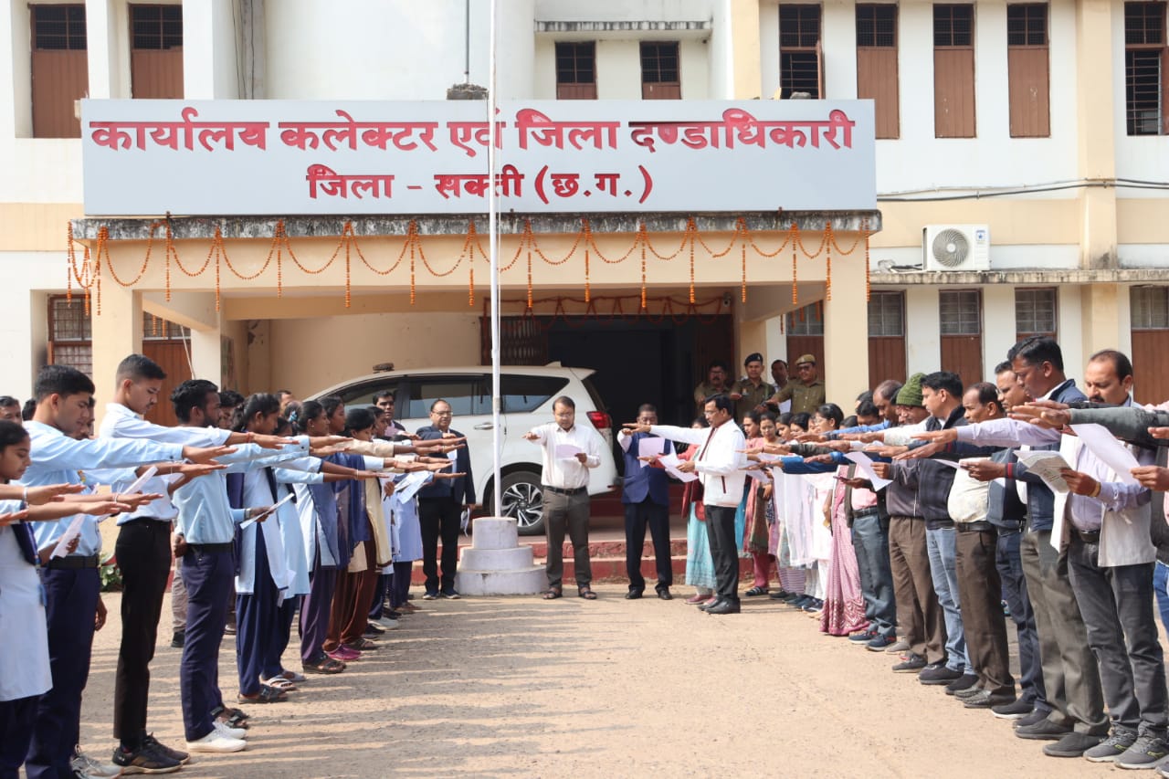 सक्ती, 26 नवंबर 2025// संविधान दिवस के अवसर पर आज कलेक्टर अमृत विकास तोपनो ने कलेक्टर कार्यालय के सभी अधिकारियों कर्मचारियों सहित छात्र छात्राओ को संविधान की प्रस्तावना का सामूहिक वाचन कराया। उन्होंने भारत के संविधान की उद्देशिका में वर्णित हम भारत के लोग, भारत को एक संपूर्ण प्रभुत्व-संपन्न, समाजवादी, धर्मनिरपेक्ष, लोकतंत्रात्मक गणराज्य बनाने के लिए तथा उसके समस्त नागरिकों को सामाजिक, आर्थिक और राजनैतिक न्याय, विचार, अभिव्यक्ति, विश्वास, धर्म और उपासना की स्वतंत्रता, प्रतिष्ठा और अवसर की समता प्राप्त कराने के लिए तथा उन सब में व्यक्ति की गरिमा और राष्ट्र की एकता और अखण्डता सुनिश्चित करने वाली बंधुता बढ़ाने के लिए दृढ़संकल्प होकर अपनी इस संविधान सभा में 26 नवम्बर 1949 को एतद् द्वारा इस संविधान को अंगीकृत, अधिनियमित और आत्मार्पित करते हैं, का वाचन कराया। इस अवसर पर अपर कलेक्टर बीरेंद्र लकड़ा, अपर कलेक्टर बालेश्वर राम, अपर कलेक्टर के एस पैंकरा, उप जिला निर्वाचन अधिकारी सुश्री कावेरी मरकाम सहित कलेक्टोरेट कार्यालय के अधिकारी कर्मचारी एवं महाविद्यालय के शिक्षक, छात्र छात्राएं उपस्थित रहे।