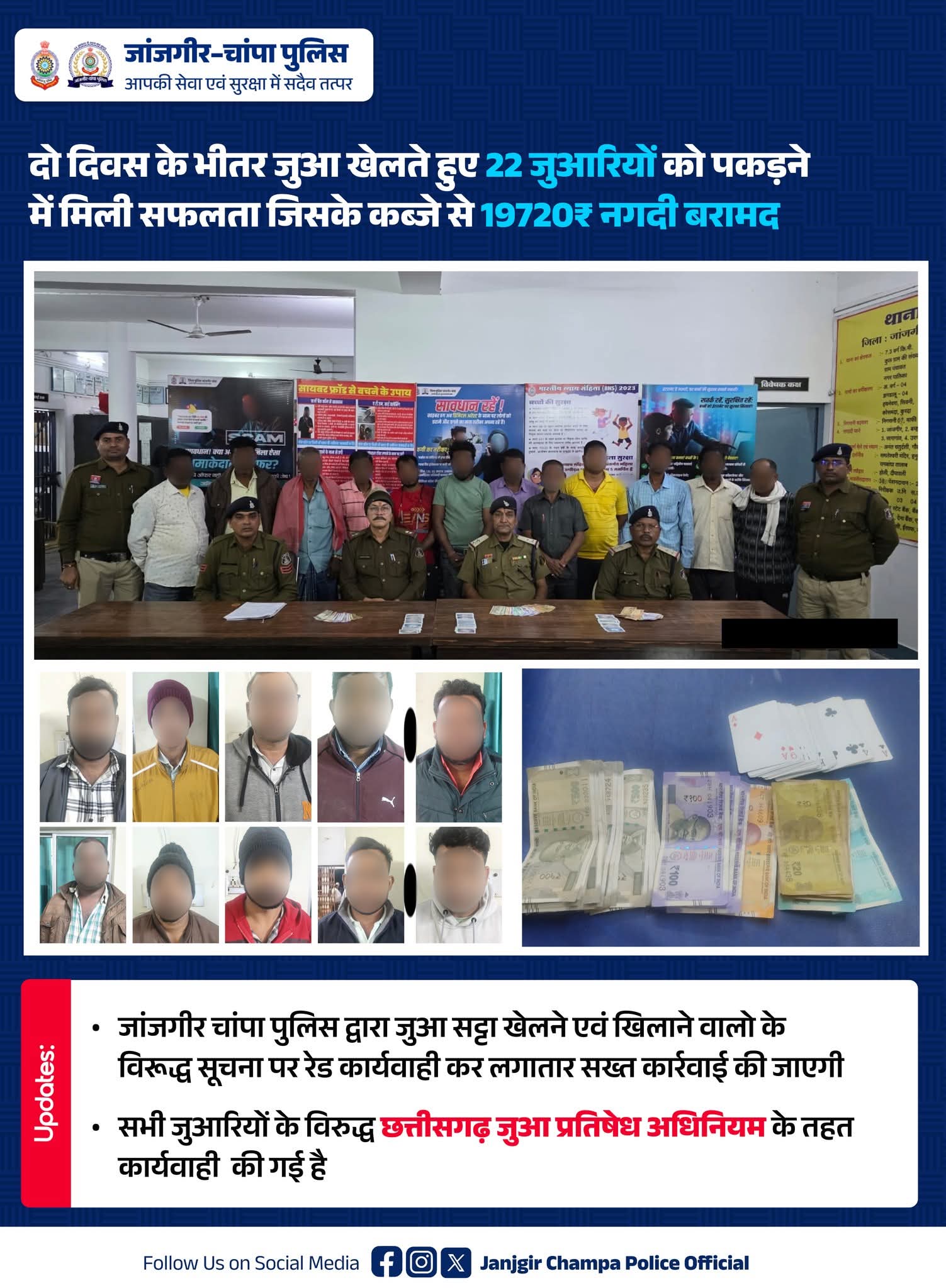 जांजगीर–चांपा पुलिस की जुआ फड़ में ताबड़तोड़ छापेमार कार्रवाई जारी है। दो दिनों के भीतर जुआ खेलते हुए कुल 22 जुआरियों को पकड़ा गया, जिनके कब्जे से ₹19,720 नगद राशि बरामद की गई। जांजगीर–चांपा पुलिस द्वारा जुआ एवं सट्टा खेलने–खिलाने वालों के विरुद्ध प्राप्त सूचना पर लगातार रेड कार्रवाई करते हुए सख्त कदम उठाए जा रहे हैं। सभी जुआरियों के विरुद्ध छत्तीसगढ़ जुआ प्रतिषेध अधिनियम के तहत कानूनी कार्रवाई की गई है। पुलिस अधीक्षक विजय कुमार पाण्डेय (IPS) के निर्देशन तथा अतिरिक्त पुलिस अधीक्षक श्री उमेश कुमार कश्यप के कुशल मार्गदर्शन में जिले के विभिन्न क्षेत्रों में छापेमार कार्रवाई की गई, जिसमें थाना चांपा क्षेत्र के ग्राम सिवनी से 12 जूआरियों तथा थाना मुलमुला क्षेत्र के ग्राम नरीयरा से 10 जूआरियों को पकड़ने में सफलता मिली है।