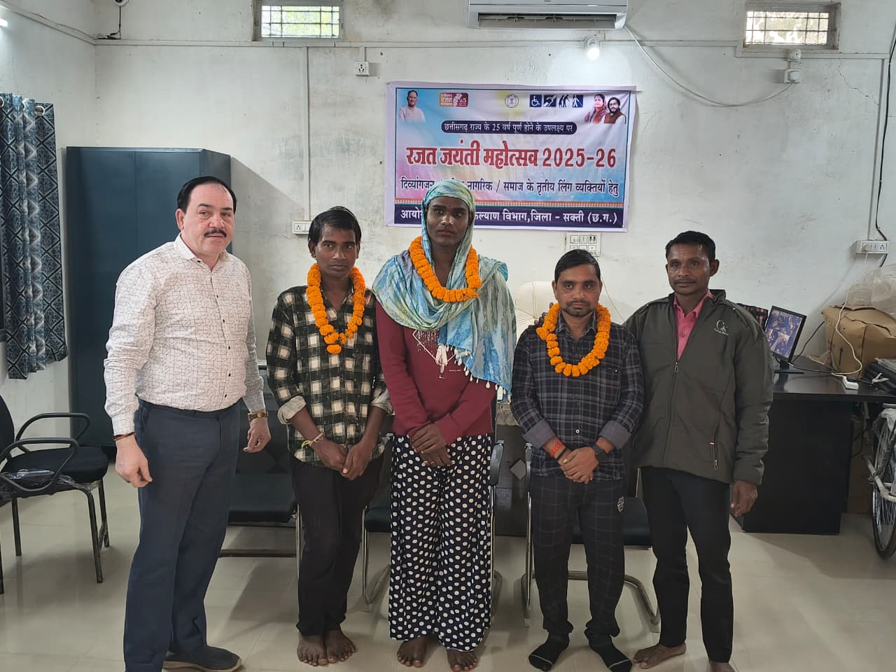 सक्ती, 19 दिसम्बर 2025 कलेक्टर अमृत विकास तोपनो के निर्देशानुसार समाज कल्याण विभाग सक्ती द्वारा रजत जयंती वर्ष 2025-26 के अवसर पर वरिष्ठजन, दिव्यांगजन एवं तृतीय लिंगी व्यक्तियों के लिए विभिन्न कार्यक्रम आयोजित किया जा रहा है। जिसमें आज उभय लिंगी व्यक्तियों के लिए जागरूकता कार्यक्रम आयोजित किया गया। कार्यक्रम के अंतर्गत जिले के उभय लिंगी व्यक्तियों के पुनर्वास एवं उनके अधिकारों के संरक्षण हेतु समाज कल्याण विभाग कार्यालय ग्राम पंचायत जेठा सक्ती में कार्यशाला का आयोजन किया गया। इस दौरान उपस्थितजनों को समाज कल्याण विभाग की विभिन्न योजनाओं की जानकारी प्रदान की गई तथा उनके संरक्षण एवं अधिकारों के प्रति जागरूक किया गया। कार्यक्रम में समाज की मुख्य धारा से जुड़ने हेतु प्रेरित करने के उद्देश्य से सहभागियों को विभागीय योजनाओं के लाभ, आवेदन प्रक्रिया एवं सुविधाओं के बारे में विस्तार से बताया गया। इस अवसर पर ग्राम पंचायत आडिल पंच श्रीमती परमेश्वरी कुमारी साहू, महेंद्र कुमार (उर्फ महिमा), गुलशनदास (उर्फ मोनी) को सम्मानित किया गया। इस अवसर पर समाज कल्याण विभाग के अधिकारी-कर्मचारी उपस्थित रहे।