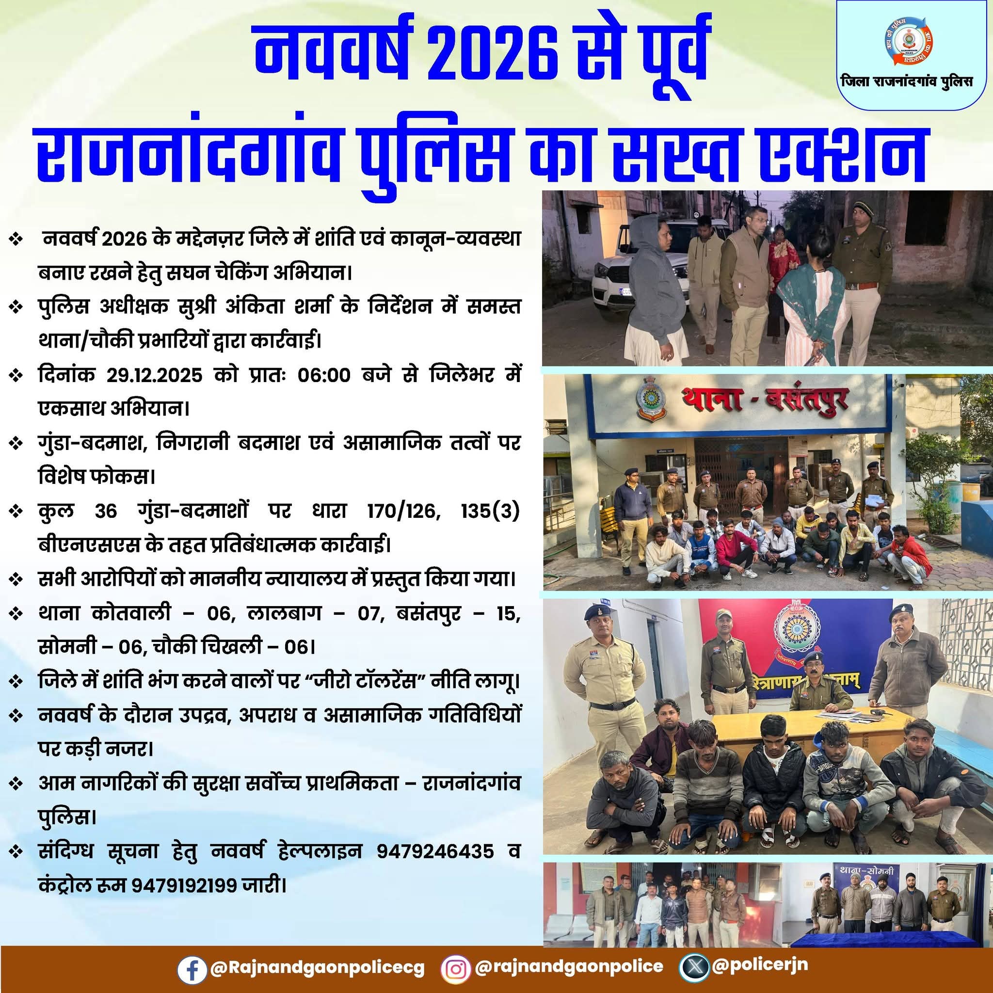 नववर्ष 2026 के अवसर पर जिले में शांति व्यवस्था बनाए रखने, कानून-व्यवस्था सुदृढ़ करने एवं आम नागरिकों की सुरक्षा सुनिश्चित करने के उद्देश्य से पुलिस अधीक्षक राजनांदगांव सुश्री अंकिता शर्मा के निर्देशन में जिले के समस्त थाना एवं चौकी प्रभारियों द्वारा आज दिनांक 29.12.2025 को प्रातः 06:00 बजे व्यापक चेकिंग अभियान चलाया गया।