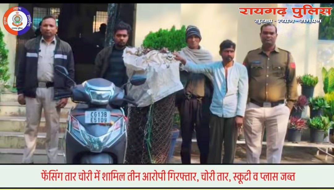 रायगढ़, 20 जनवरी । थाना चक्रधरनगर क्षेत्र अंतर्गत इंदिराविहार में वन विभाग द्वारा संरक्षित क्षेत्र की सुरक्षा के लिए लगाए गए फेंसिंग तार की चोरी करने वाले तीन आरोपी – (1) शत्रुघन बरेठ पिता खिकराम बरेठ उम्र 60 वर्ष निवासी ग्राम अड़भार थाना अड़भार जिला शक्ति, हाल मुकाम विनोबानगर थाना चक्रधरनगर, (2) संतराम बैरागी पिता शिवचरण बैरागी उम्र 33 वर्ष निवासी विनोबानगर कचरा गोदाम के पास थाना चक्रधरनगर तथा (3) दिनबंधु बैरागी पिता भगवानदास बैरागी उम्र 35 वर्ष निवासी विनोबानगर कचरा गोदाम के पास थाना चक्रधरनगर जिला रायगढ़ को पुलिस ने गिरफ्तार कर न्यायालय में पेश करते हुए रिमांड पर भेज दिया है।