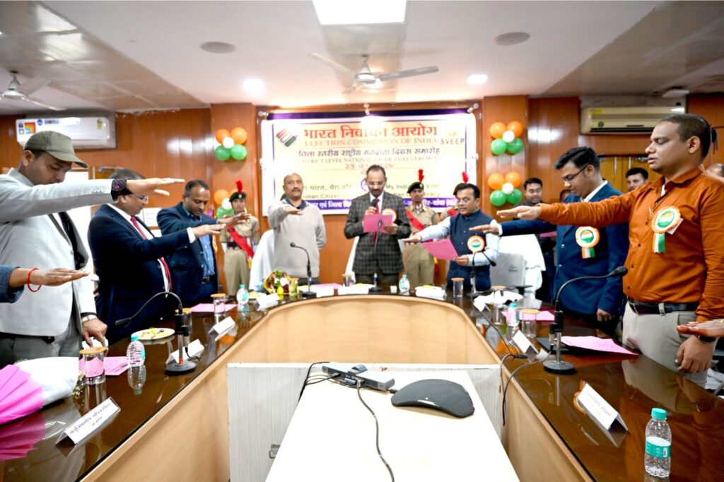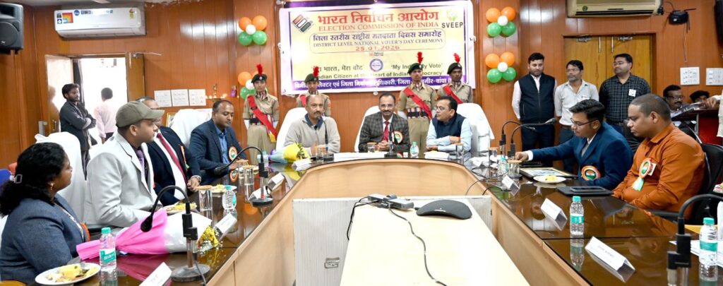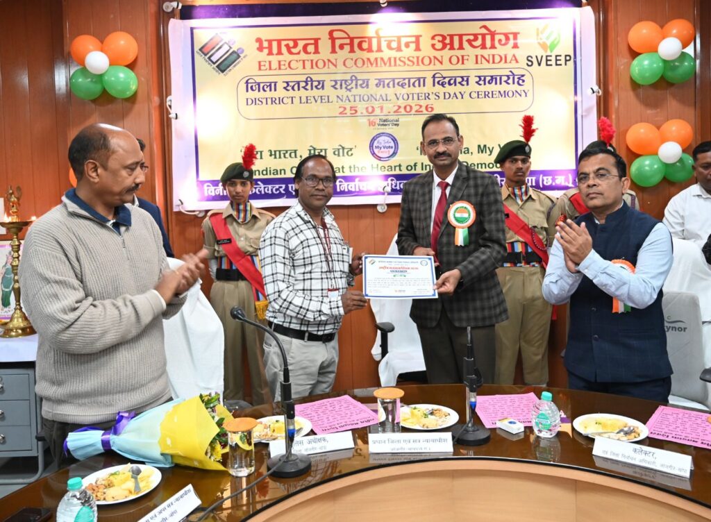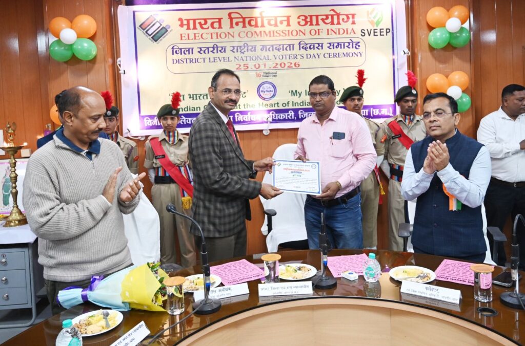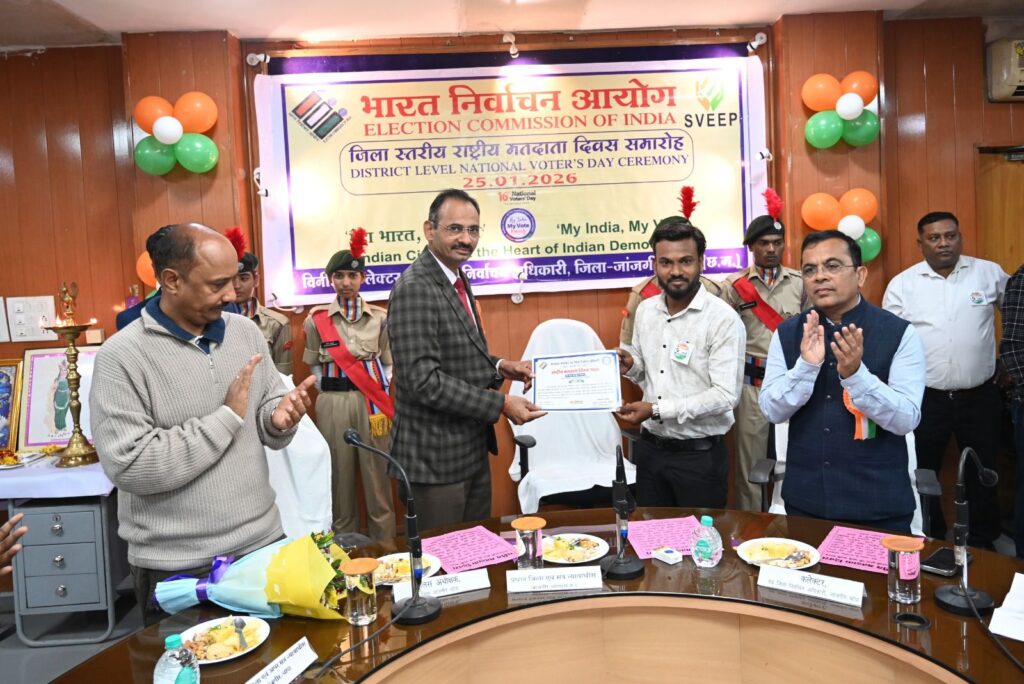 जांजगीर-चांपा 25 जनवरी 2026/ भारत निर्वाचन आयोग, नई दिल्ली के निर्देशानुसार 16वां राष्ट्रीय मतदाता दिवस कार्यक्रम आज कलेक्टोरेट सभाकक्ष में मेरा भारत, मेरा वोट की थीम पर आयोजन किया गया। कार्यक्रम में राष्ट्रीय मतदाता दिवस के इतिहास एवं महत्व की विस्तृत जानकारी दी।