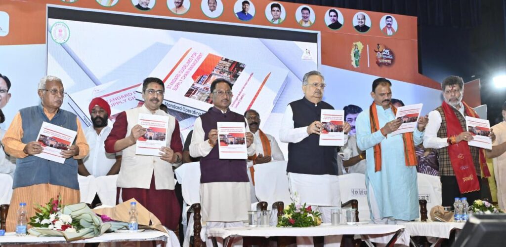मुख्यमंत्री विष्णु देव साय आज राजधानी रायपुर के पंडित जवाहरलाल नेहरू स्मृति चिकित्सा महाविद्यालय के सभागार में छत्तीसगढ़ मेडिकल सर्विस कॉर्पोरेशन लिमिटेड (सीजीएमएससी) के नव नियुक्त अध्यक्ष श्री दीपक म्हस्के के पदभार ग्रहण कार्यक्रम में शामिल हुए और मुख्य अतिथि की आसंदी से उन्हें शुभकामनाएं दी। इस दौरान मुख्यमंत्री सहित अतिथियों ने सीजीएमएससी सप्लाई चैन मैनेजमेंट एसओपी का विमोचन किया।